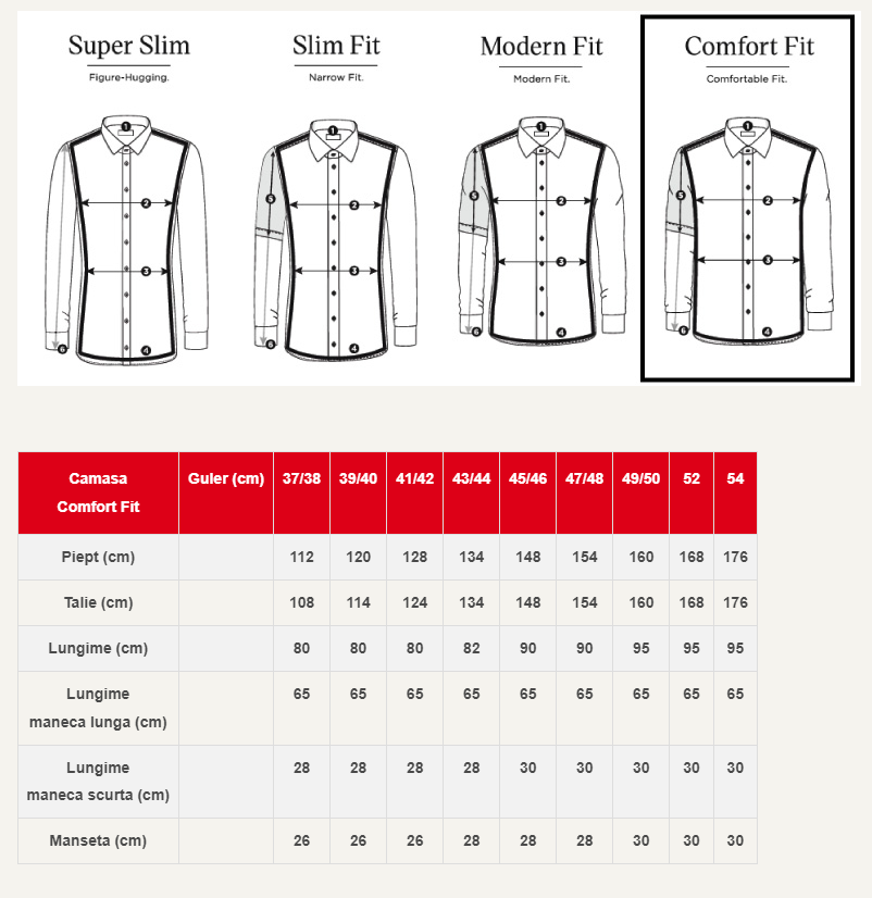 Această cămașă COMFORT FIT este prevăzută cu un guler Kent simplu, tivul fiind rotunjit la lungime normală, astfel încât poate fi purtată și peste pantaloni.