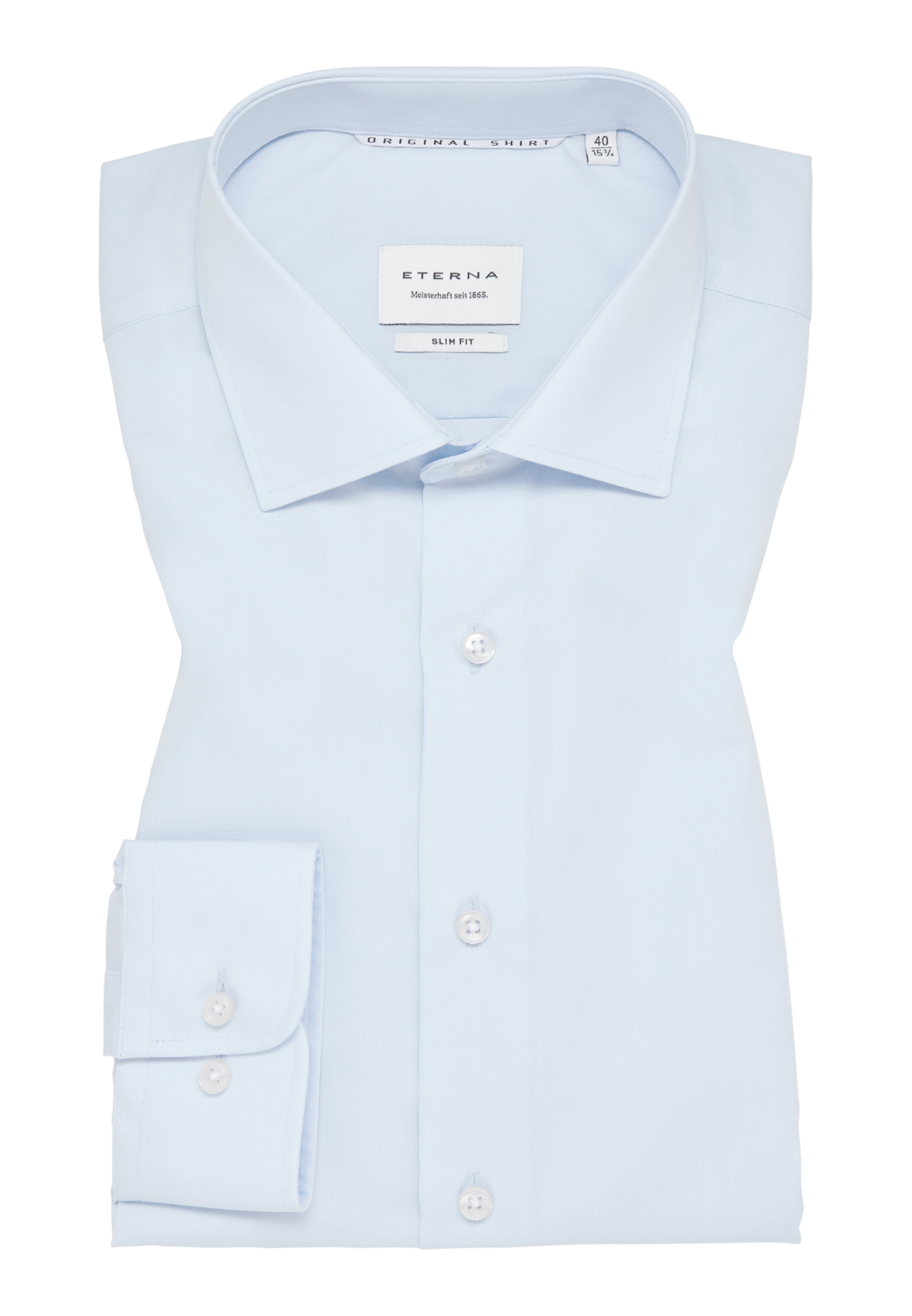 Această cămașă SLIM FIT cu mânecă lungă, de culoare uni, este confecționată cu un guler clasic Kent.